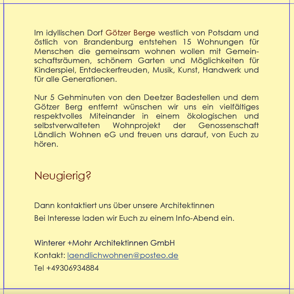 Die Genosschaft Ländlich Wohnen eG bietet für allen Bewohner*innen und Beteiligten eine langfristige Wohnperspektive in einem toleranten, respektvollen und gemeinwohlorientierten Umfeld. Natur: Wald und Seen sowie die Havel, Kultur: große Gemeinschaftsräume für viele Aktivitäten und Platz zum spielen, sich ausprobieren und gemeinschaftich Wohnen sind vorhanden.