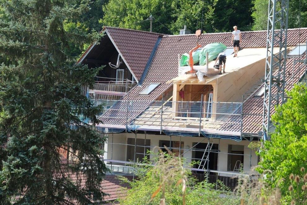 Leider warf uns ein massiver Wasserschaden in der Entwicklung unseres Projektes zurück, da eine komplette Hälfte des Wohnhauses (mit 7 Appartementes) nicht mehr bewohnbar war. Doch wir nutzten dies als Chance und führten für das komplette Wohnhaus eine grundlegende energetische Sanierung durch. Wir überzeugten in einer bundesweiten Ausschreibung die KfW-Bank, die dena (Deutsche Energieagentur) + das BMWi (Bundesministerium für Wirtschaft) von der Qualität unseres Energiekonzeptes (Niedrigtemperatur-Flächenheizung > Klimadecke zum Heizen + Kühlen // Ringgrabenkollektor und Photovoltaik als Energiequellen // Wand- und Dachdämmung mit Holzfaser // Lehmputz + Baumwollputz // u.v.m. // ...) und wurden deshalb als eines von nur wenigen Mehrfamilienhäusern als bundesweites Modellprojekt ausgewählt. Der Umbau wurde Mitte 2024 abgeschlossen. Nun stehen nur noch Detail- und Verschönerungsarbeiten an, auch die großzügigen Nebengebäude warten noch auf die Renovierung.