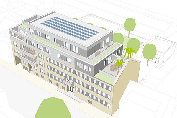 - Gemeinschaftliche Nutzung von Räumen, Freiflächen und Dachgarten, die die Wohnungen ergänzen und Platz bieten, Nachbarschaft zu leben, kreativ zu gestalten und unterstützend zu wohnen