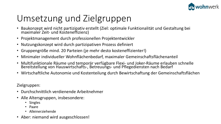 - Zielgruppe: Keine bestimmte Zielgruppe, Familien, Mehrgenerationenwohnen, Seniorinnen und Senioren, Singles, vielfältig interessierte und engagierte Menschen