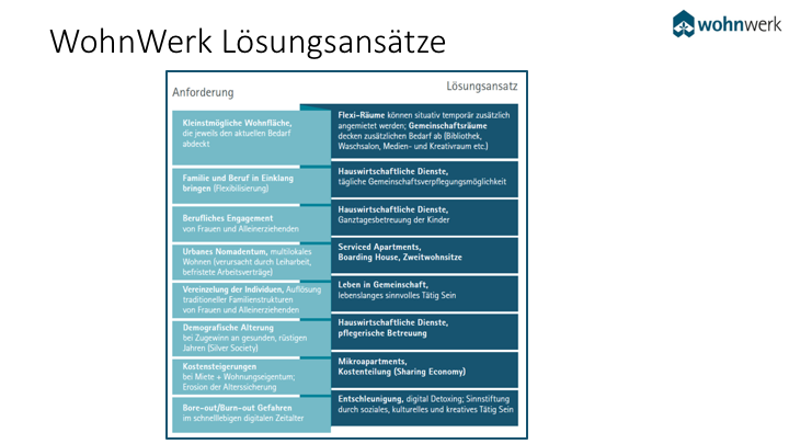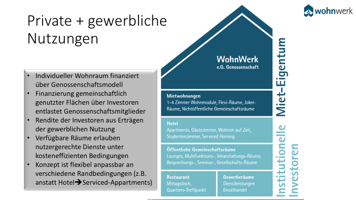 Das WohnWerk Wohnkonzept umfasst Mietwohnungen und gewerbliche Einheiten, wie ein Hotel, ein Restaurant und weitere Dienstleistungen, die noch nicht endgültig festgelegt sind. Diese Dienstleistungen hängen vom jeweiligen Standort und den Bedürfnissen der Bewohner ab und können beispielsweise eine Kinderbetreuung, eine Pflegestation oder eine Arztpraxis umfassen. Notwendige Funktionen sollten, soweit möglich, in gemeinschaftlich genutzten Räumen angeboten werden. Dazu zählen Bibliotheken, Ateliers/Werkstätten sowie Meditations- und Bewegungsräume. Diese sollten aus Kostengründen auch für gewerbliche Zwecke genutzt werden können, sofern dies sinnvoll ist.